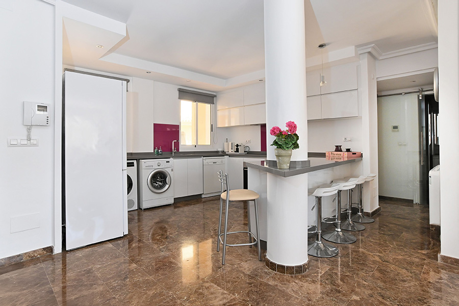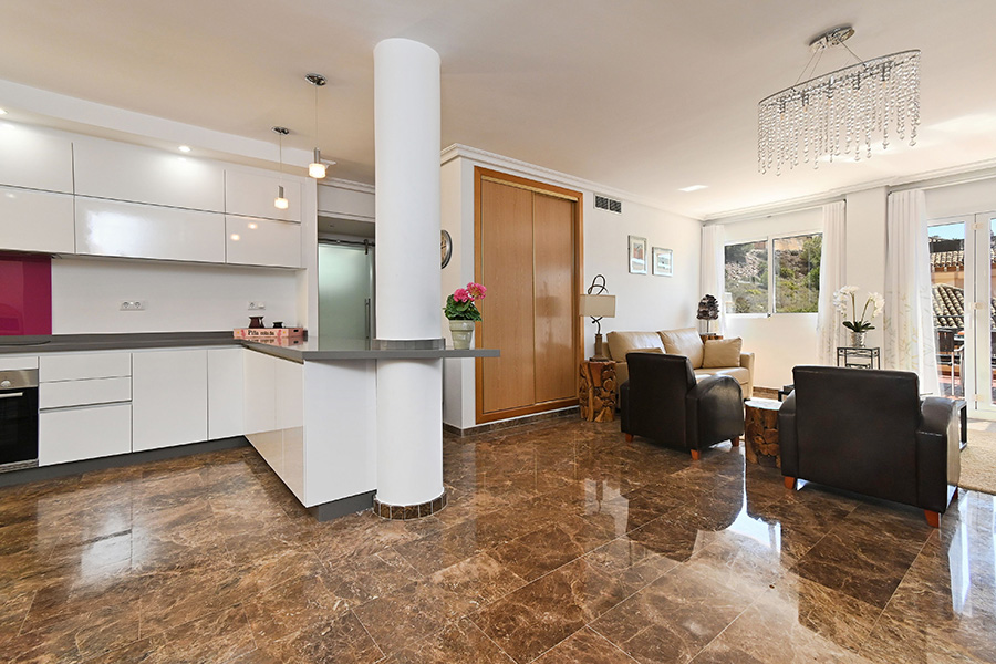 The open plan lounge, dining room and kitchen has satellite or cable TV. Bi-fold patio doors lead to the terrace with outdoor dining facilities, gas barbecue and views towards the Mar Menor.