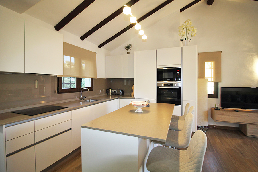 The open plan kitchen has a large island with bar stools and is well equipped with dishwasher, microwave, oven, hob, extractor fan, and fridge freezer.