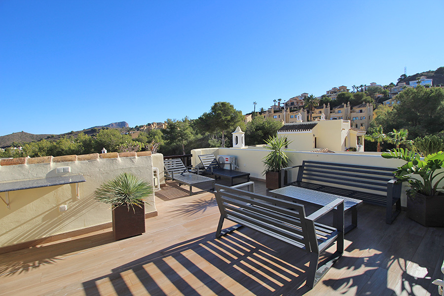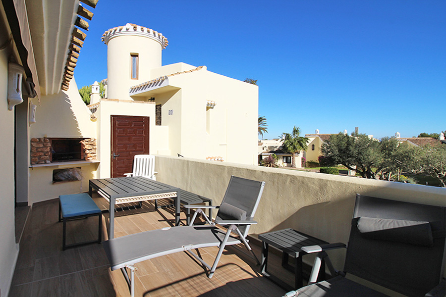 An external staircase leads up to the roof terrace which has outdoor lounge furniture, sun loungers and views across the Resort towards the sea.