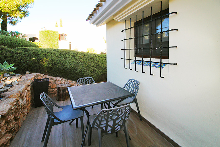 Two bedroom detached villa with accommodation on one level. Private terraces, barbecue and use of nine community pools. Free wifi.