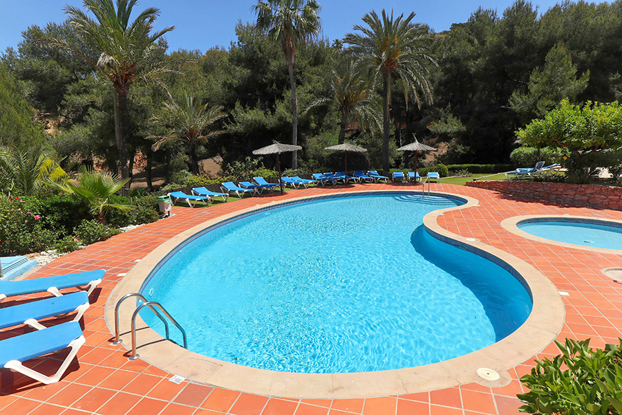 From the lounge there is a staircase down to the bedrooms and bathrooms. The master bedroom has a double bed, an en-suite bathroom and has patio doors to a ground floor terrace which is next to one of the communal swimming pools and the gardens. The second bedroom has a twin beds and also has patio doors to the ground floor terrace with access to the pool and the gardens. This bedroom has the use of separate bathroom. There is a washing machine in a hall cupboard.