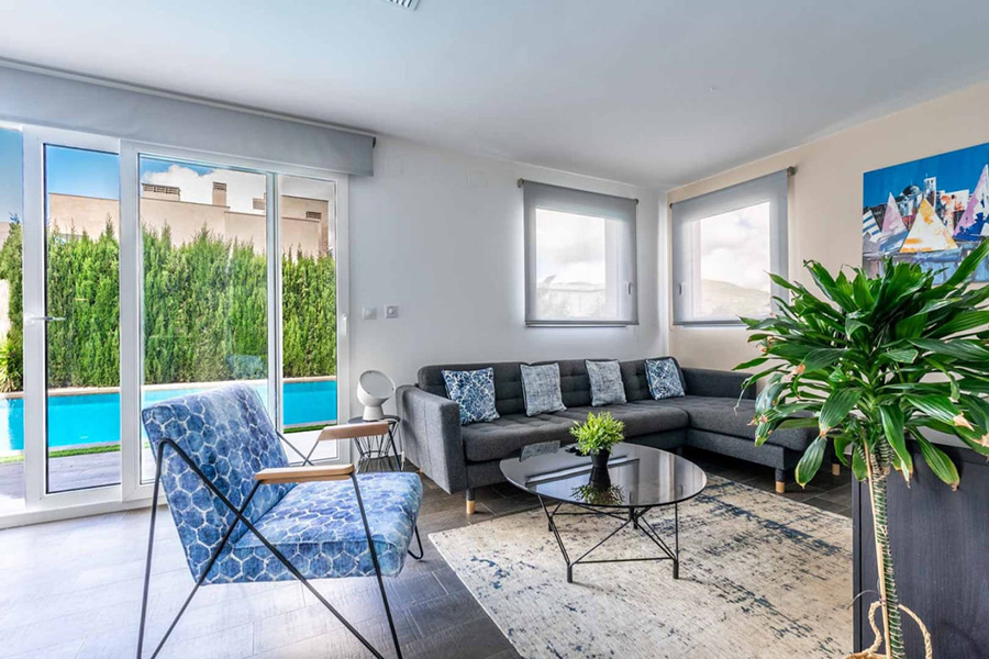 Lounge area – Sofas, coffee table, satellite or cable TV. Doors to terrace and pool.