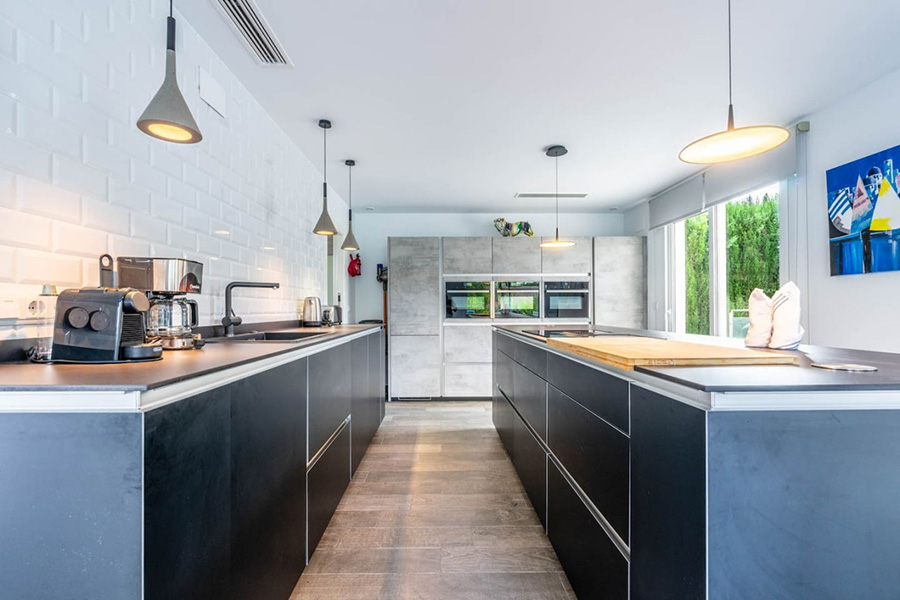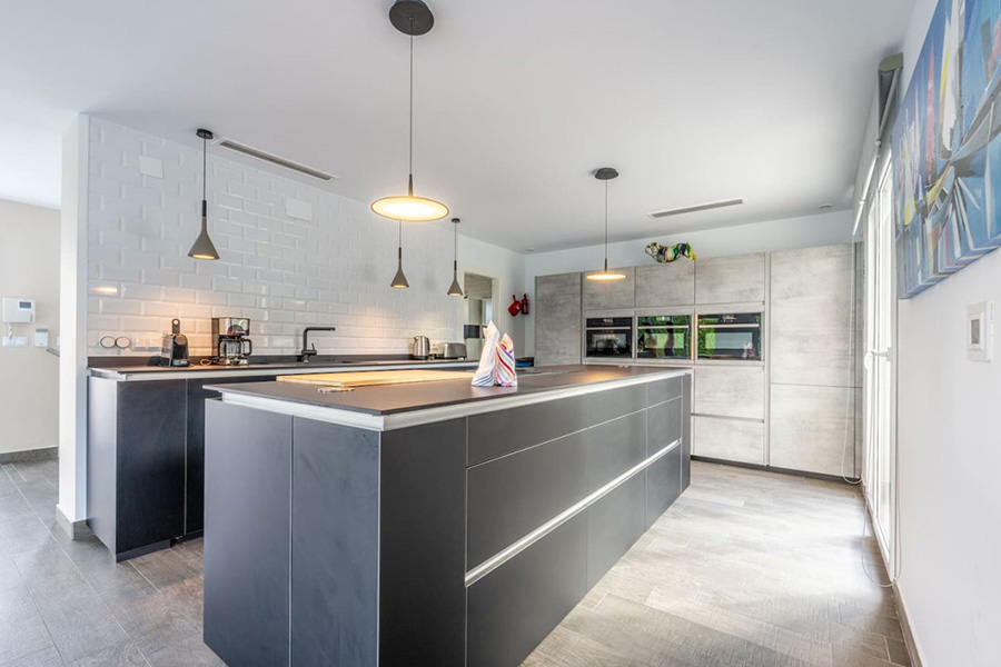 Kitchen – beautiful modern kitchen with double oven, hob, microwave, large fridge and freezer, dishwasher, washing machine and large island.