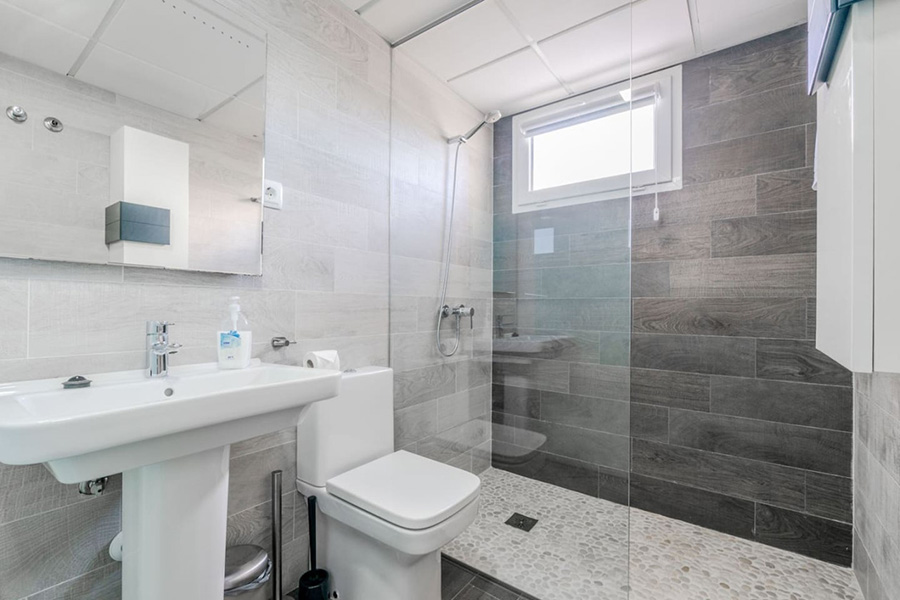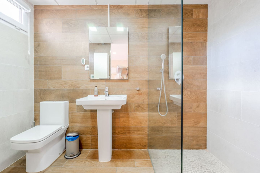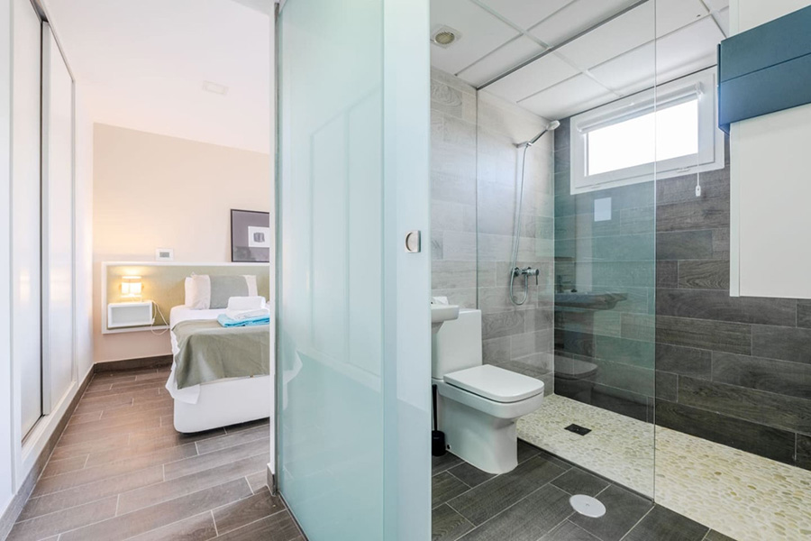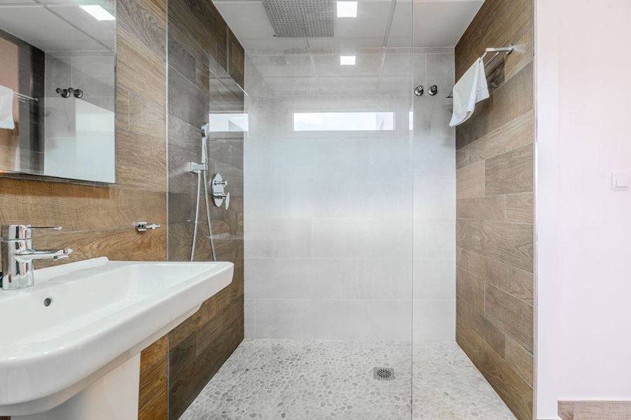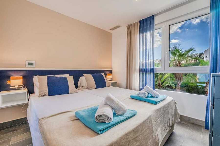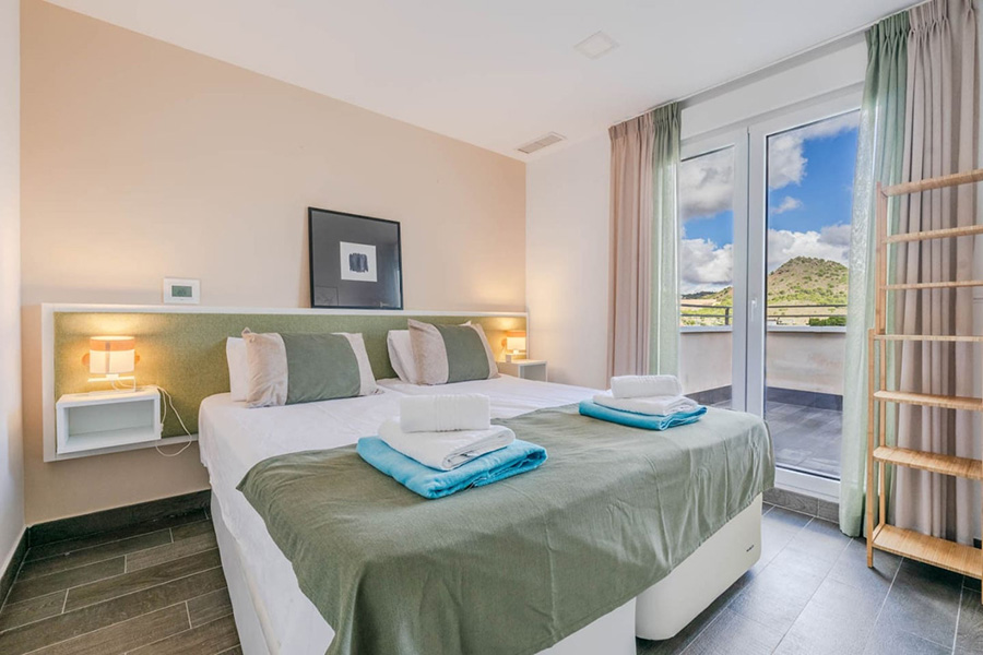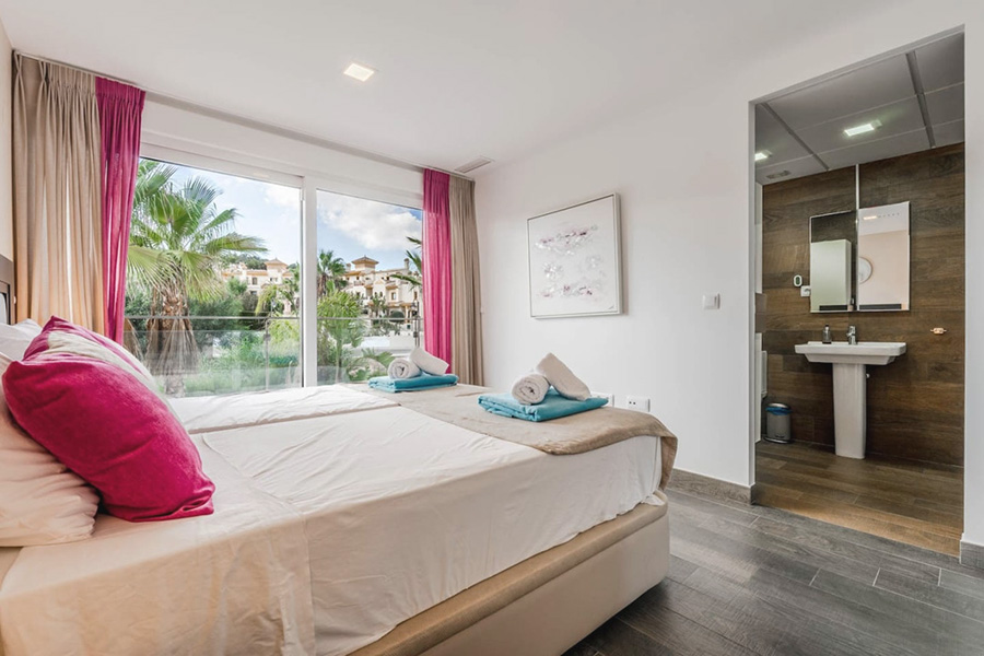 Bedroom two – Super king-size bed which can be made as single beds if preferred, patio doors to an upper terrace/balcony. En-suite bathroom.